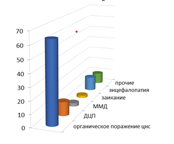 В структуре нозологий, в круглосуточном и в дневном стационарах, по данным отчетного периода также преобладают: ДЦП (различные формы) – 11 %, заикание – 2 %, ММД с различными синдромами – 2,7 %, энцефалопатия – 11,4 %, прочие заболевания – 8,9 % (см. диаграмму 1).